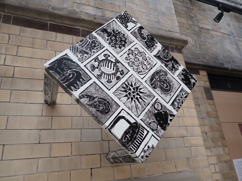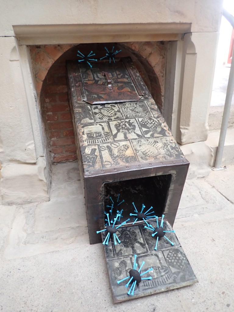 A storage unit for coal that has been adapted to house studded Ovoids. A work realised for one of the Fireplaces in the Old Parcels Office at Scarborough Railway Station. The printed images on Bunker’s surface are of ….. ‘Artefacts with Indeterminable Functions’