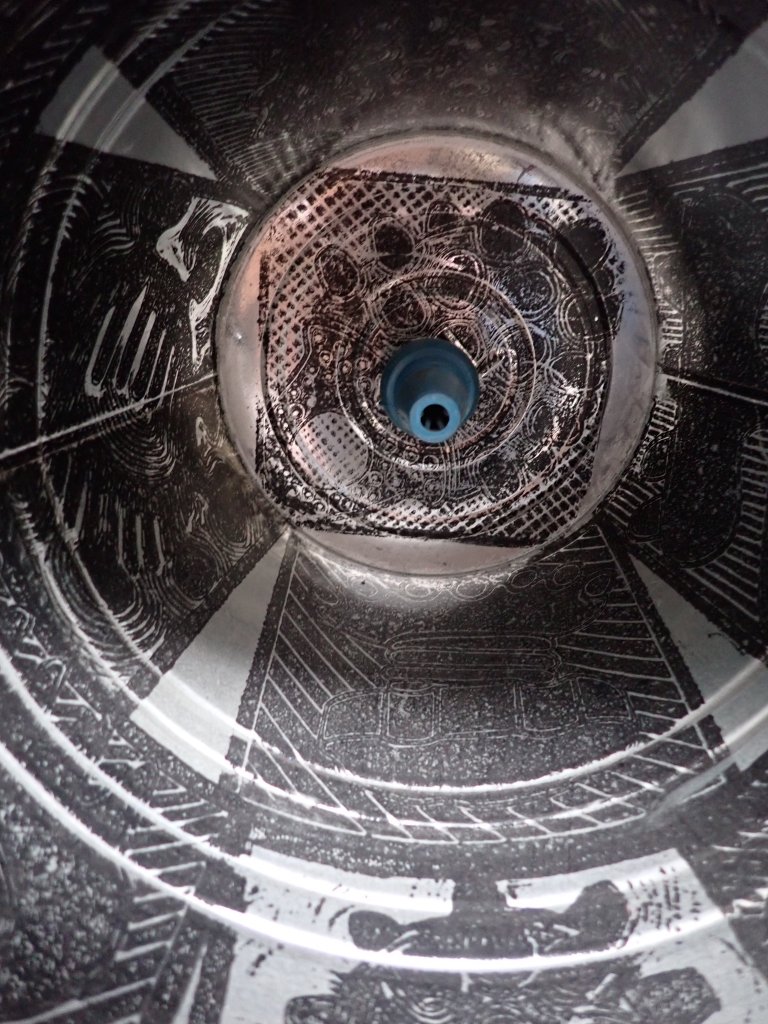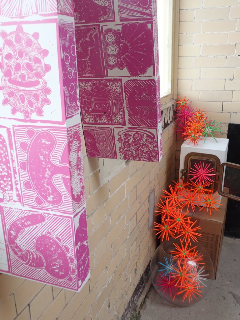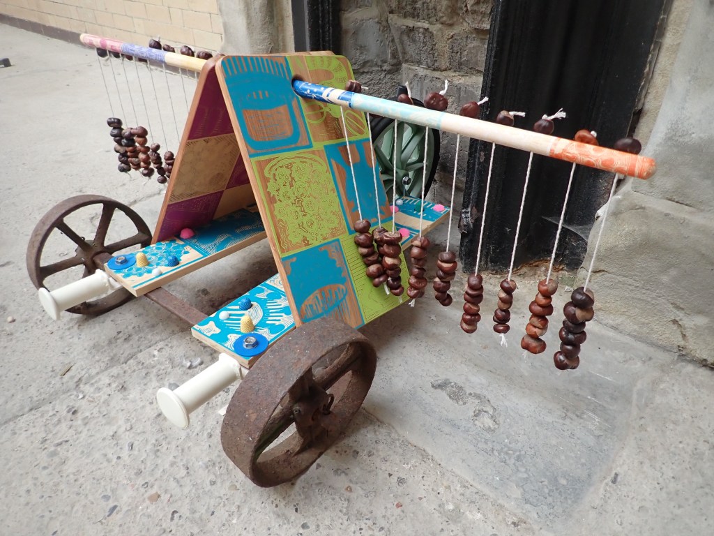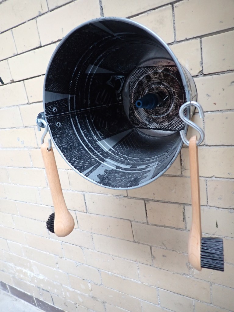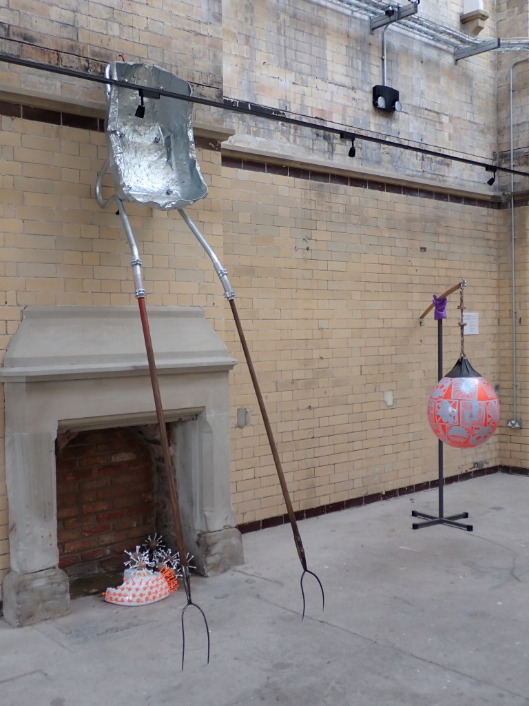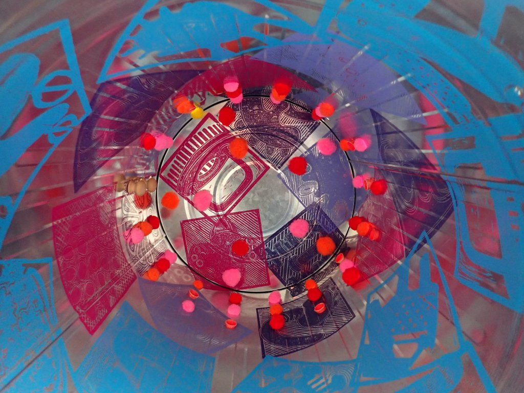 A shiny garden incinerator that has been decorated with Lino prints, pompoms and finger cones. Its cool exterior and positioning enables the viewer to connect with its darker and warmer interior.