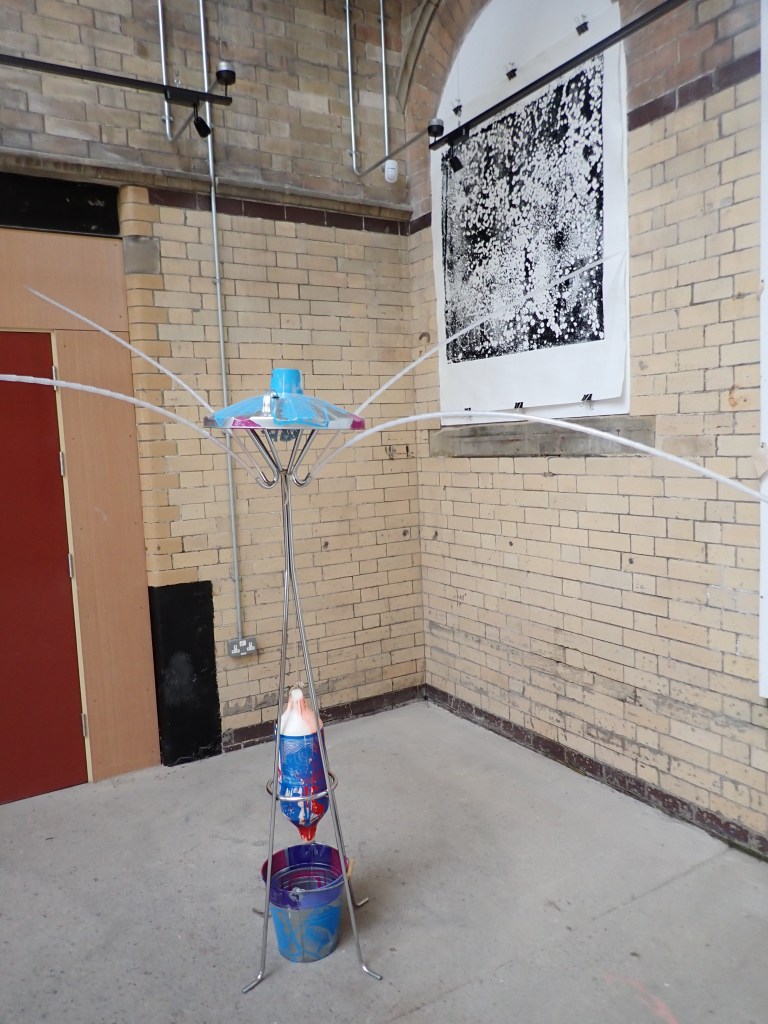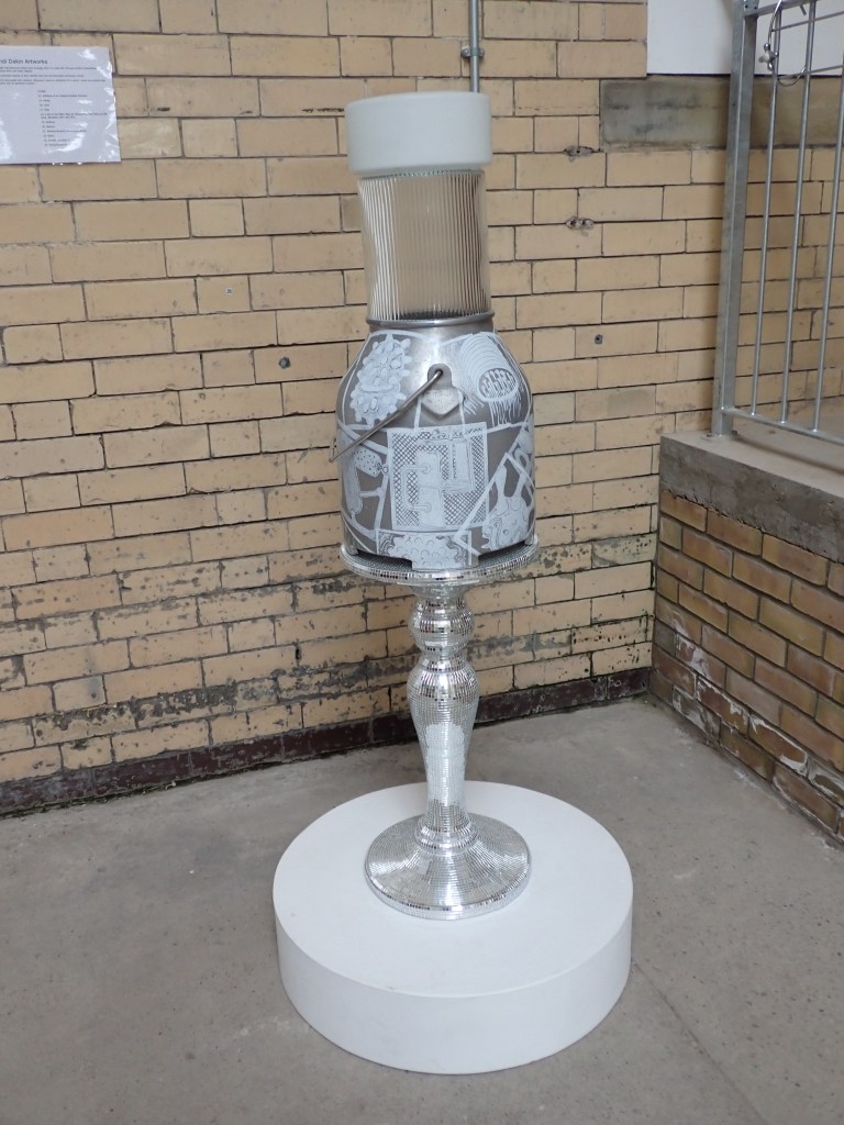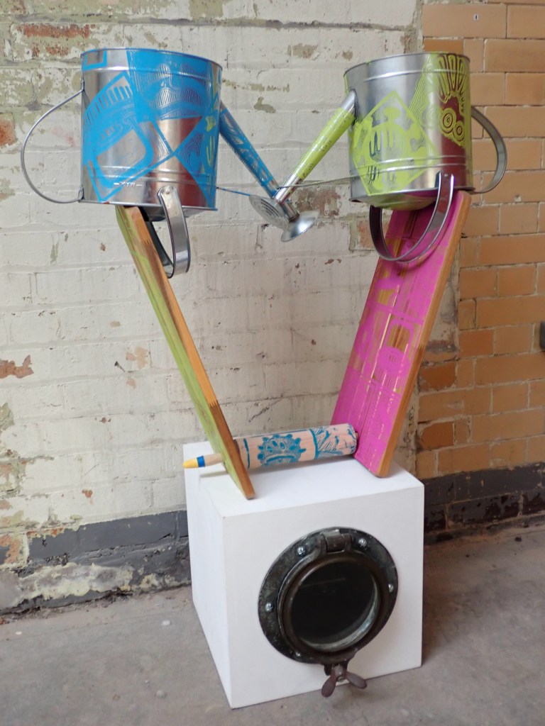 An assemblage of characterful components all sourced separately over a period of several years that came together for the Fire and Water exhibition in Scarborough. The tower of objects is internally lit by an assortment of flashing lights to emulate light signals to trains and ships. The milk churn is decorated with Lino printed images of…… ‘Artefacts with Indeterminable Functions”