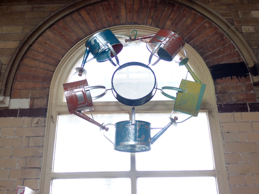 The Arched Windows in the Old Parcels Office is an enriching Architectural Feature, a fitting context for a sculpture. A circle of watering cans fitted the Arch perfectly. The Garden Riddle held the cans in their roundel and the view through the mesh connected with the exterior station Architecture. The union of gardening objects pose as a Rose Window.