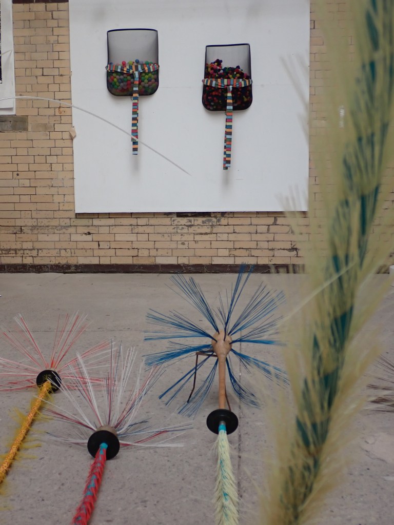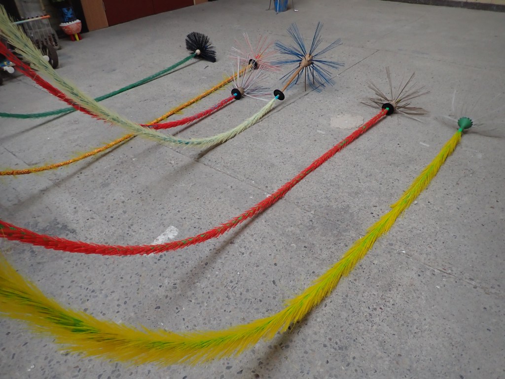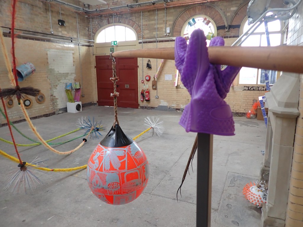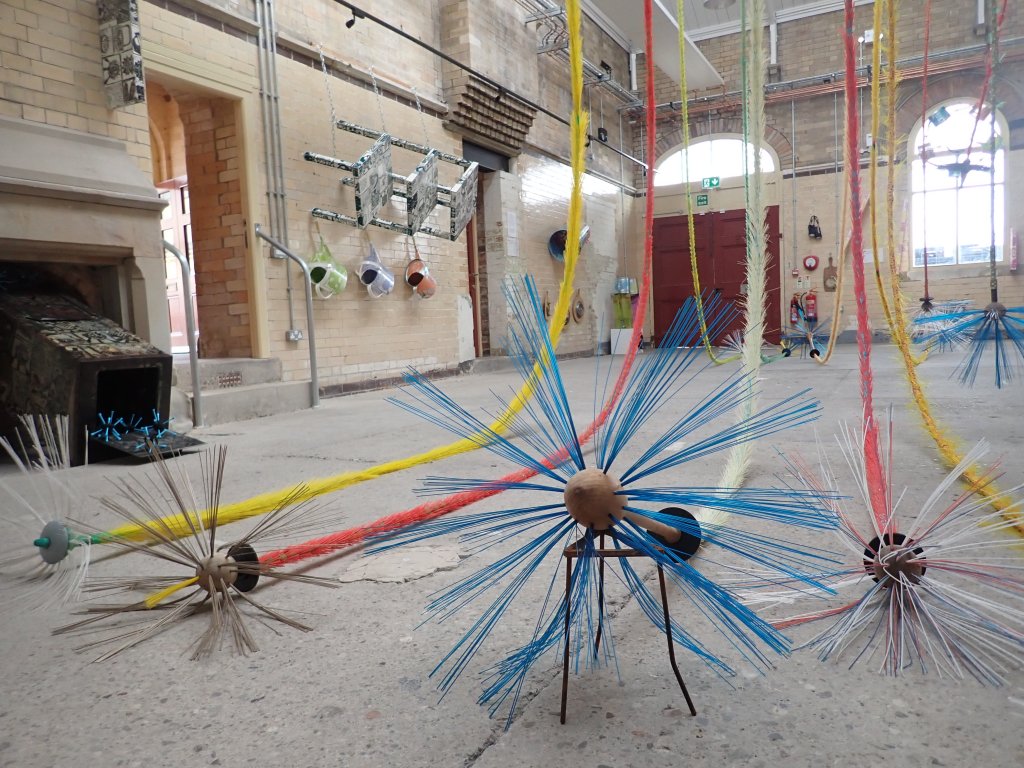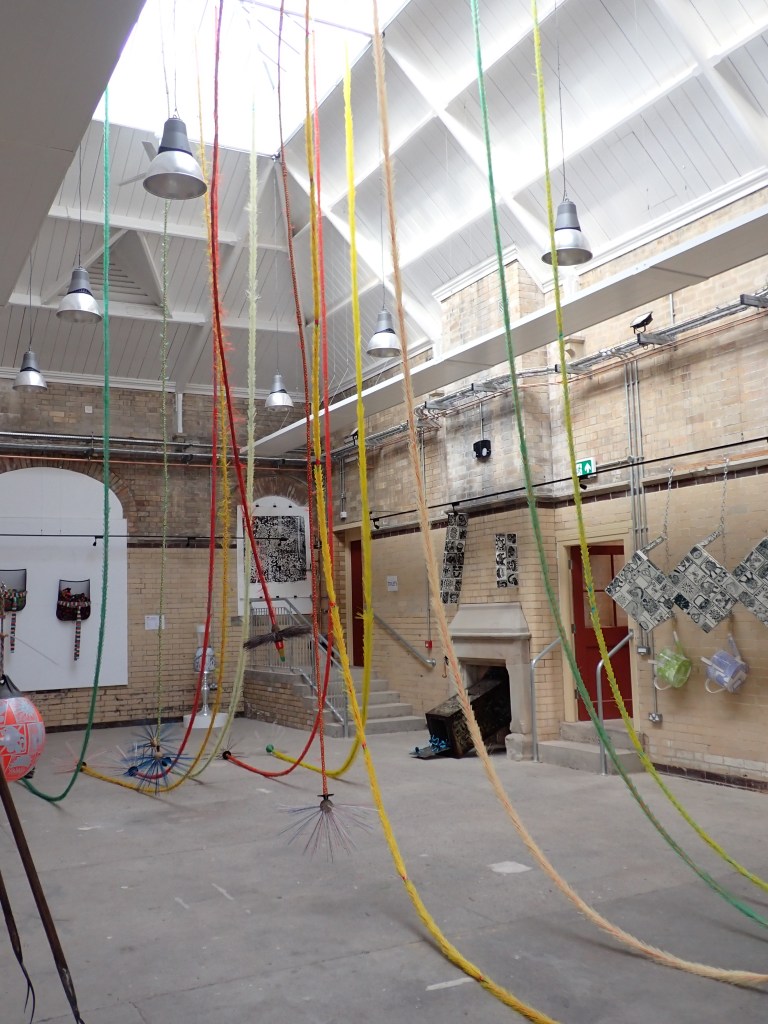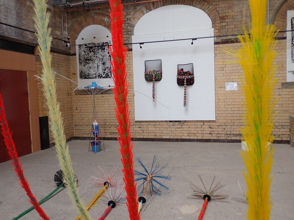 ‘Resting Brooms’ (detail) The sculpture is suspended from rafters 30 feet into the roof space bringing a reassuring veil of calm to the room. Chimney sweeps flue brooms and plumbers drain rods have been embellished and assigned new flamboyant identities. Colourful, glorious and suspended, they are collectively resting as if they have not long since returned from a party.