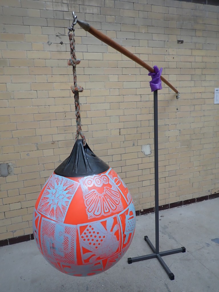 A Fishermans marker buoy, found washed up on the high tide line. As a re-assigned object her surface is printed with images of ‘Artefacts with indeterminable functions’